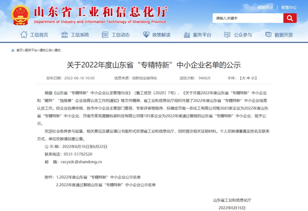 水發奧翔公司順利入選2022年度山東省“專精特新”中小企業