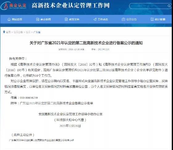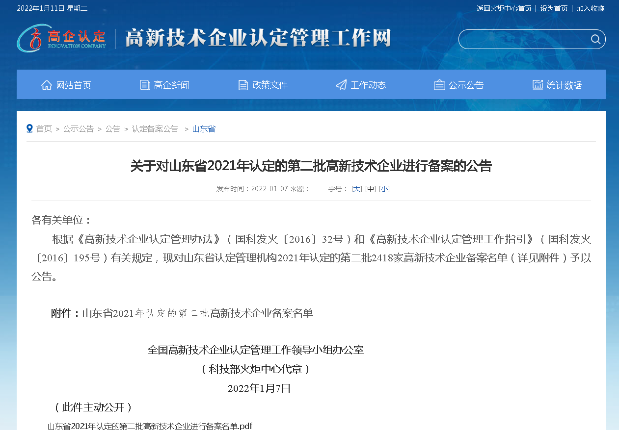 1月7日,全國高新技術企業認定管理工作領導小組辦公室發布《關于對山東省2021年認定的第二批高新技術企業進行備案的公告》。青島能安恒信科技有限公司成功列入《山東省2021年認定的第二批高新技術企業備案名單》。